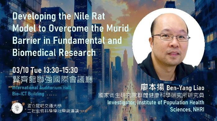 本院3/10(二)邀請到財團法人國家衛生研究院群體健康科學研究所廖本揚研究員蒞臨主講Developing the Nile Rat Model to Overcome the Murid Barrier in Fundamental and Biomedical Research ,地點在1F聯強國際會議廳,歡迎全院師生踴躍參加!